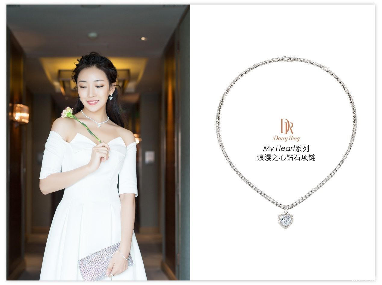 整件钻石项链洋溢着纯净的气息,富有优雅风范,和菅纫姿的气质很配。“每份浪漫只为你”的寓意更是为珠宝增添无限魅力。主钻为一枚重达5克拉的罕见心形钻石点睛,自然身价惊人;由美钻紧密有序镶嵌而成的锁骨链,让整条项链吸收更多光芒。