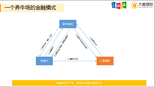打个比方:以养牛场为例,养殖户需要牛苗,饲料和技术,要把成牛销售出去,蒙羊集团则需要牛羊供应商来供应货源,二者在业务上是完全互补共赢的,可是在这个过程中会出现一个问题,那就是养殖户没有钱去从蒙羊集团那购买牛羊饲料和技术,蒙羊集团也不愿投入高额成本去承担这种风险,那么谁来解决这一顾虑呢?这时候场景金融的优势就体现出来了,大麦理财会根据二者所需资金情况,结合实地考察和市场需求以及整条产业链的可行性,来给双方放款,从而打通了畜牧业的上下游两端,盘活了整个产业链条,帮助企业构建良性可持续的发展生态,大麦理财在这中间充当了一个孵化器和资本助推器的功能角色,为实业发展注入强劲的生命力。