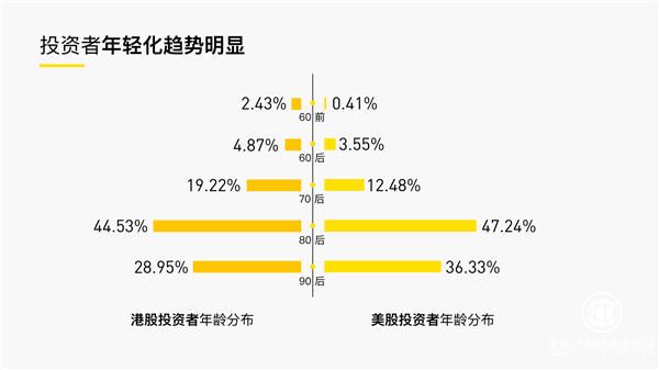 他还在演讲中分享了老虎证券今年关于港美股投资者的调研报告。根据报告显示:港股和美股投资者年龄分布年轻化趋势非常明显,90后都已经进入到港股投资领域。在现在的海外投资里面,港股美股还是投资者首选,由于流通性问题和最小交易单位的限制,海外房产和海外其他金融品种占比较少。