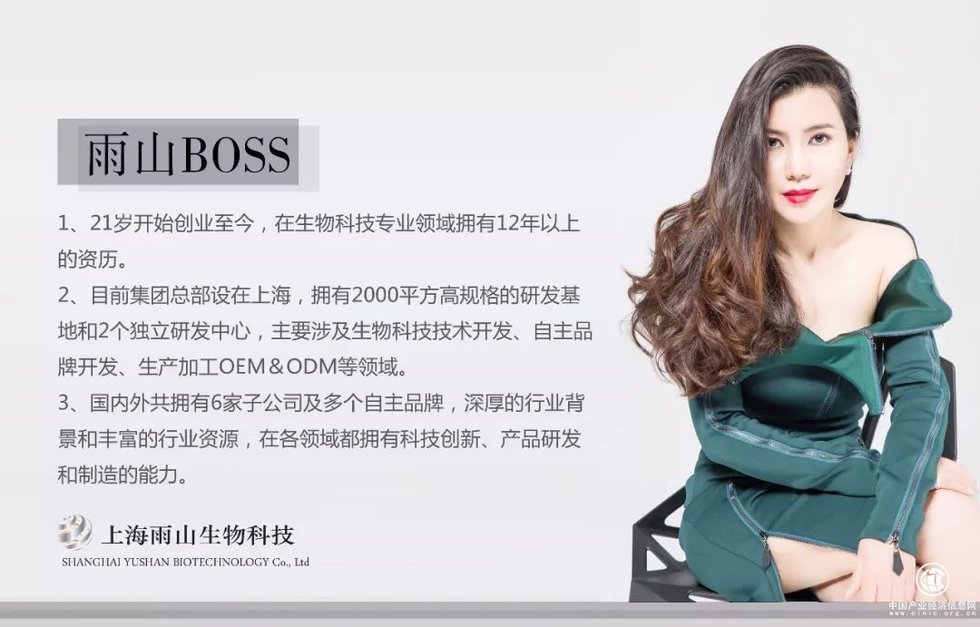 雨山董事长——从2003年开始创业,在生物科技领域拥有12年以上的资历。在不断的成长积累中,围绕生物科技技术研发、自主品牌开发(美容食品、健康食品、化妆品)帮助众多优秀品牌生产加工,涉及OEM&ODM等领域