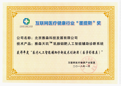 本次大会取自象征着古希腊的智慧女神“墨提斯”而命名。意在鼓励在云计算、大数据、人工智能、智能硬件、无线网络等信息通信技术领域具有优秀先进经验的机构和企业。大会总共收到了超过100项报名申请,共同角逐“墨提斯奖”的14大类奖项。最终,雅森科技凭借公司产品雅森天玑?乳腺钼靶人工智能辅助诊断系统(医学影像类)荣获“医疗人工智能辅助诊断技术创新奖”。