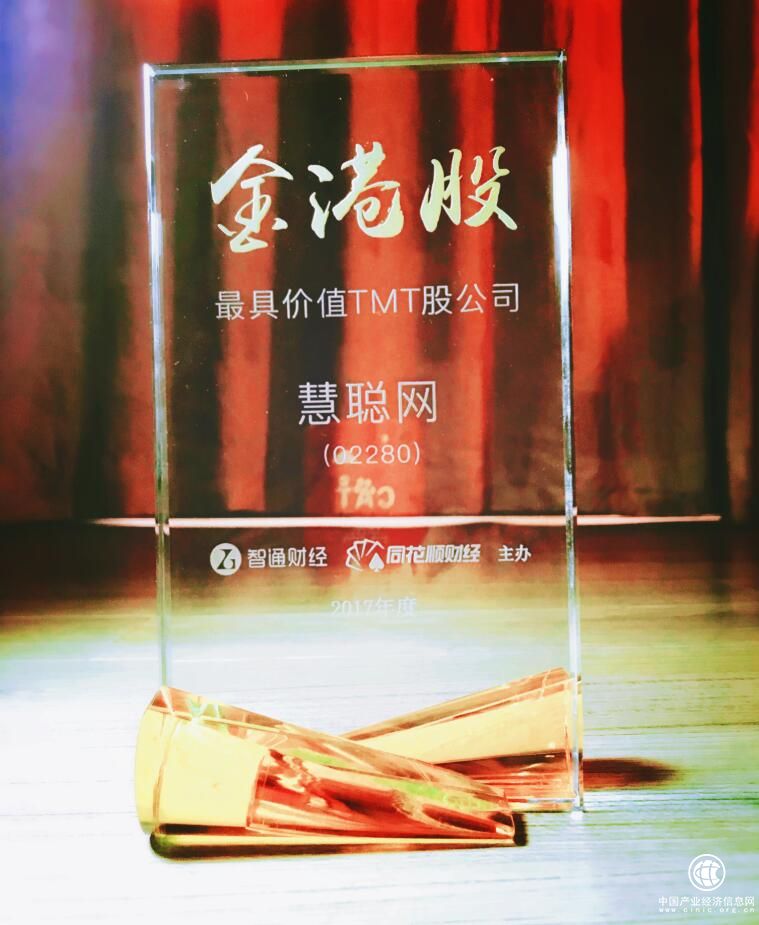 2018年1月18日,由智通财经与同花顺主办,雪球协办,香港交易所及香港中资证券业协会支持举办的“洞见港股新价值高峰论坛暨2017‘金港股’”颁奖典礼在深圳举行。会上,“2017年金港股最具价值TMT股公司”奖项揭晓。慧聪网(HK.02280)获“2017年金港股最具价值TMT股公司”奖项。同时获此奖项的,还有IGG、联想集团、金蝶国际、神州控股、网龙等9家公司。