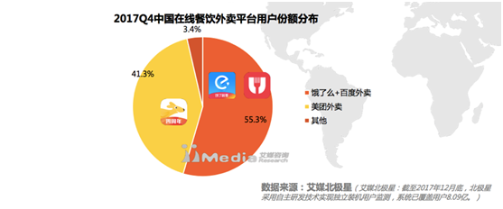 从在线餐饮外卖平台来看,饿了么收购百度外卖后,2017年第四季度市场份额占比55.3%,领跑市场。美团外卖占比41.3%,紧随其后。外卖市场正式从三足鼎立转变成双雄争霸。