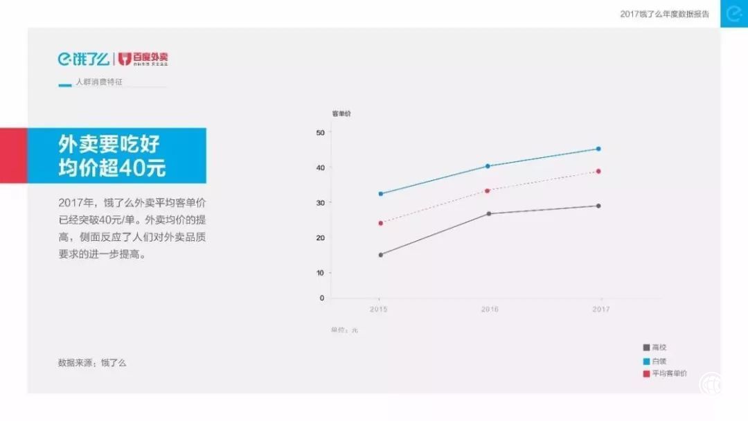 而且消费的客单价也有明显的提升,消费主力从低客单价高校学生群体(23元)转化为高客单价白领群体(43元),饿了么平台数据显示,目前平均客单价已突破40元。其中,点个牛肉面顺带一盒现切水果已是家常便饭,人群比例达到38%。而且非正餐时间的外卖购买频次也在上升,消费者有了早餐、下午茶、夜宵等更多场景下的需求,高频打低频的商业逻辑正在被验证。