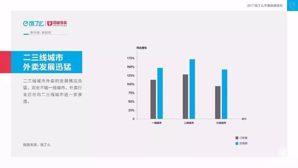 美团因其团购业务,在非一线城市一度风生水起。饿了么也看到渠道下沉的潜力,正在布局加强业务覆盖,培养三四线城市用户外卖消费习惯。截止到2017年12月底,饿了么覆盖的城市数量超过2000+,在我国绝大部分的县级城市全面铺开。