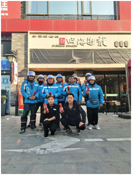 (门店附近的站点骑手与四海游龙商家负责人合影)