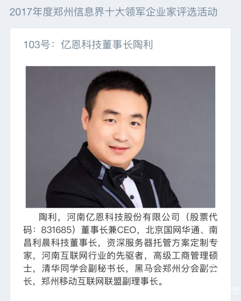 近日,由郑州信息化促进会主办的2017年度郑州信息界十大领军企业家评选活动拉开帷幕。本次活动共有109位信息届大佬参与,网站托管上市公司董事长陶利也在激烈的角逐之中。