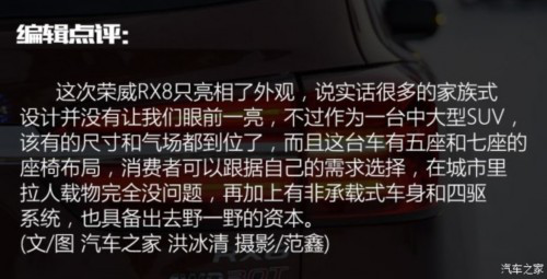 新春将近,在我们正在热热闹闹准备年货的时候,荣威也给我们准备了一件“礼物”,荣威RX8。这款在冰雪挑战赛有出色表现的豪华SUV,有着非承载车身+TOD四驱系统的七座中大型SUV,只不过这次我们只能先车外看看它,先来一睹它的容貌吧。