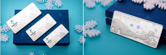 银章背面中间为一朵精致的雪花,突出冬奥会的特点,雪花中间裂开,如一束追光,光束照耀之处折射出长城和天坛,代表着北京和张家口的赛区特点,唯美浪漫且不失庄重。