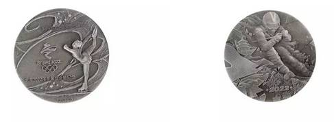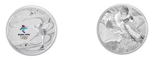 该银章正面为花样滑冰运动员在冰面上滑行的痕迹所构成的“2022”字样,优雅唯美。背面为自由滑雪运动员高速滑行的瞬间,飞扬的起的白雪,展现出冬奥会的力与美。