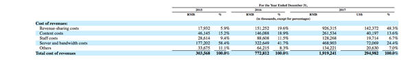 根据招股书显示,2017年B站的主要成本来自收入分成9.26亿元人民币,占总成本的48.3%,带宽服务费用4.69亿元人民币,占总成本的24.4%,内容和版权成本2.62亿元人民币,占总成本13.6%,以及薪酬等其他支出。