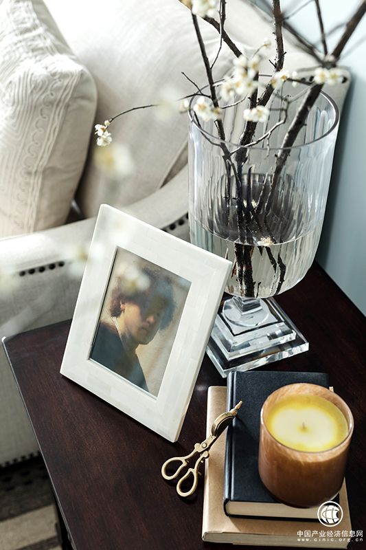 沙发扶手处的柔美,桌柜直角线形的硬朗,地毯上点线层次交替,符合不同区域的细节需求。枝桠向上伸展,白梅朵朵绽开,是积极的新生状态。