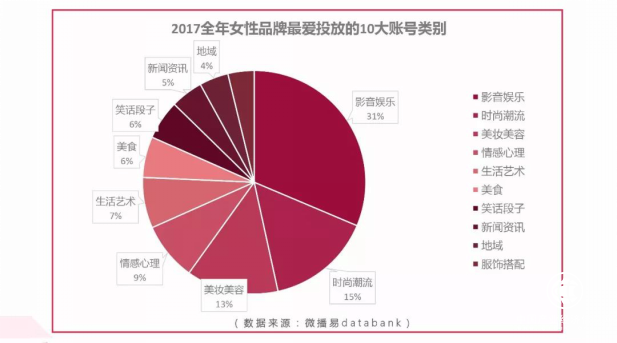 女性类品牌在投放中,也呈现出了比较明显的女性特色,对于垂直类账号投放更高。微播易数据显示,2017年全年,影音娱乐、时尚潮流、美容美妆类自媒体账号最受女性品牌喜欢,占比总投放的55%。