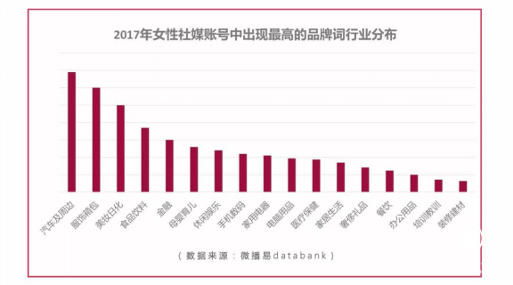 此外,微播易还对2017年女性社媒账号中出现最高的品牌词行业分布情况进行了分析,发现: