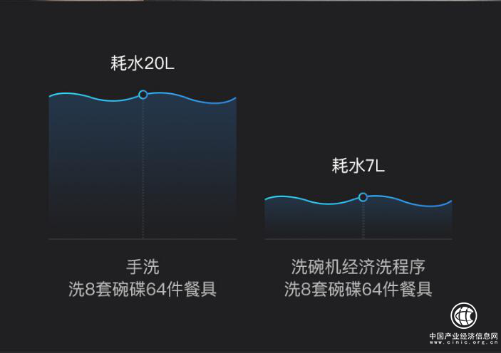 经过多次实验评估,机洗在满载64件餐具,经济洗的情况下,仅仅耗水7L。而经过多次手洗实验,按正常洗涤速度,最快也需要耗水约20L,且还不能确保清洗干净。