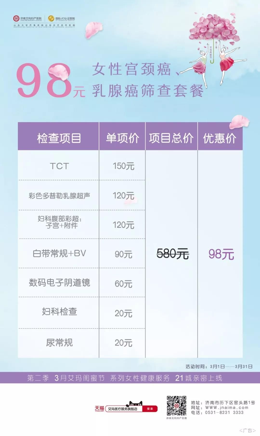3月,在这个充满爱与幸福的月份里,我们曾约定要一起健健康康到老。为了给女性朋友更好地服务,艾玛妇产为泉城女性准备了第二重好礼:两癌筛查体检套餐——原价580元的体检套餐限价98元,让女性朋友精致地生活着,细致地爱自己。