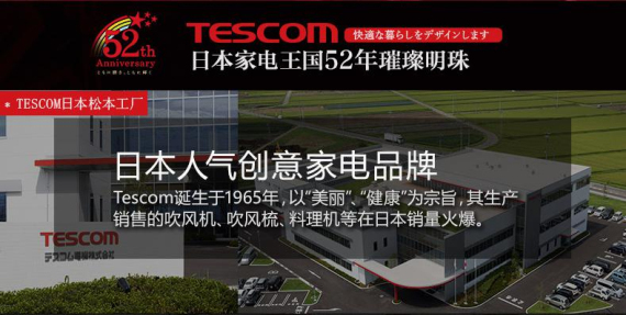 TESCOM是日本人气创意家电品牌,成立于1965年东京市,以“美丽”“健康”为宗旨,长年生产来在日本市场研发、制造、销售各种小型家电,包括吹风机、吹风梳、料理机等。