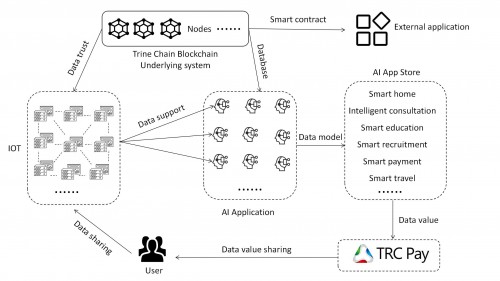 在Trine Chain的价值互联网络中,通过物联网推动不断的创造庞大的、高价值的数据资源,推动数据价值体系和网络信用体系的建立,接下来通过物联网的数据资源为人工智能设备建立数据模型,建立数据模型之后开始推出应用(应用包含以下但不限于以下应用:智能咨询、智能分析、智能教育、智能识图、智能医疗、智能会议、智能娱乐、智能购物、智能招聘、全息智能家庭教师、泛娱乐虚拟智能助手、智能家居、智能出行、智能销售系统等),应用经过人用户使用后又把数据反馈到物联网,形成数据存储后有作用于人工智能,而TRC Pay将作为整个Trine Chain价值互联网络的生产关系的智能合约,也是生产力的兑现。是TRC在整个价值互联网络的载体。