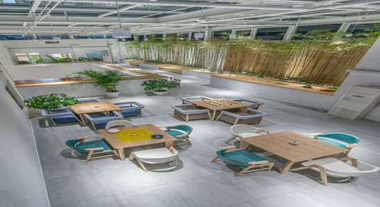 在空中花园里,通过将原有室外空间和室内空间相融合,加大了公共区域,使得空间更开阔。同时,把景观引入室内,整个空中花园在整体布局上更加别具一格。