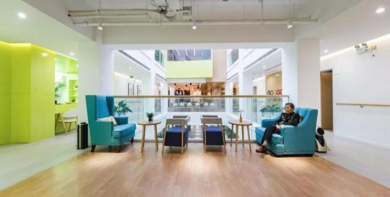 【邻里家长者乐园】的建筑整体由伦敦扎哈设计师事务所的年轻设计团队操刀设计改造,整体风格清新、时尚,充满了年轻和活力气氛。