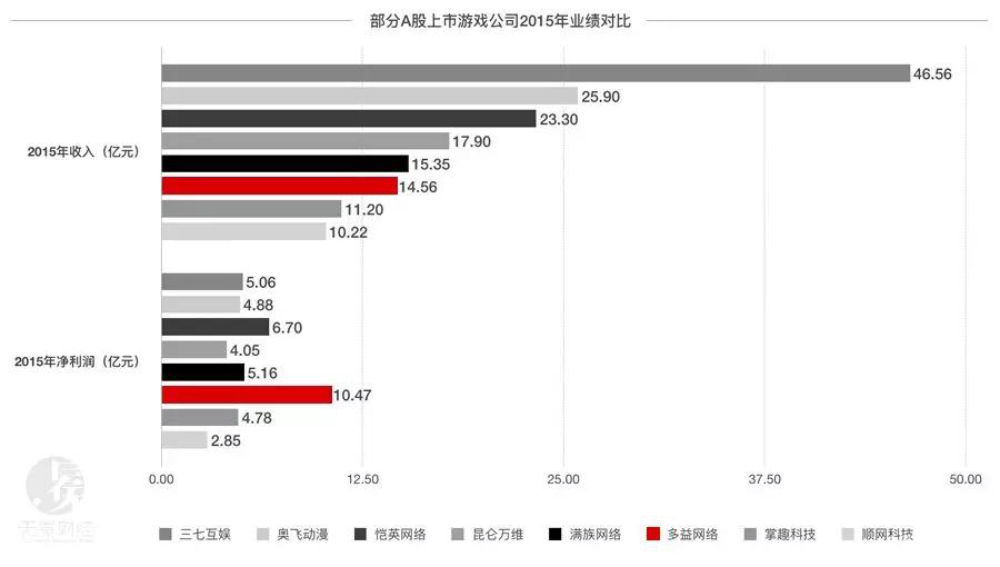 ▲2015年多益网络与部分A股上市游戏公司业绩比较