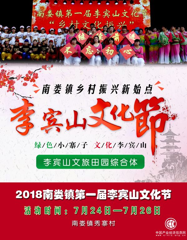 党的十九大以来,南娄镇新一届党委、政府认真贯彻落实党的十九大精神和习近平新时代中国特色社会主义思想,坚持“规划+投资+文化+旅游”的改革发展理念,积极发挥传统产业优势,大力实施乡村振兴战略,大胆探索“李宾山”文旅品牌打造和旅游景点布局,刨寻乡村旅游的文化之根,拓宽农村产业发展模式,南娄镇将在7月24、25、26日举办“2018李宾山第一届文化节”,以此为新始点,全面发掘本地文化资源、宣传提升南娄新时代的新形象,坚定不移实施乡村振兴战略,以秀寨村为试点率先示范,带动周边村产业振兴和助推全镇的乡村旅游发展攻略,着力构建“特色绿色南娄、产业融合南娄、园林文化南娄”。