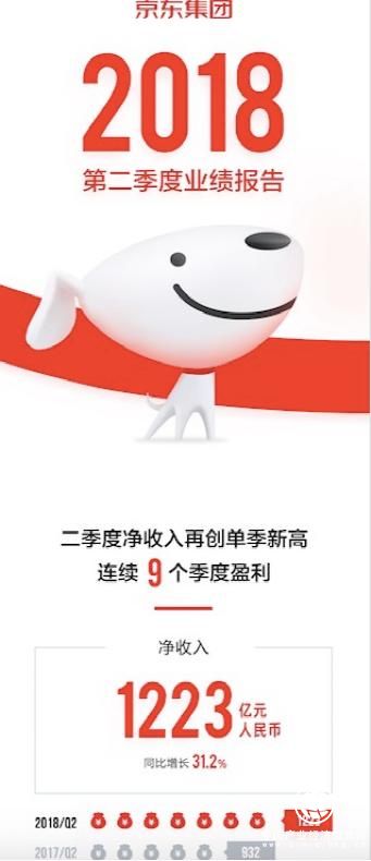 8月16日,京东集团公布2018财年二季度业绩报告,报告显示京东集团本季度净收入一经达到1223亿元人民币,同比增长31.2%,不仅创下单季净收入新高,还实现连续9个季度盈利。
