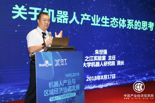 从认真贯彻落实国家领导人科技创新思想,深入实施创新驱动发展战略出发,围绕机器人产业生态体系,在对机器人产业的发展动态进行深入分析的前提下,浙江大学机器人研究院院长、之江实验室主任朱世强所作的主旨报告,强调了以机器人产业的二元特性出发,如何推动区域经济的协调发展和创新,积极探索一条机器人产业生态体系的发展新路径,在兼顾机器人主体产业的基础上,大力推动包括主题游乐园、赛事、培训、旅游等为一体的机器人融合产业道路,并以此聚集全球跨界人才,做好机器人产业园、机器人小镇的建设道路。