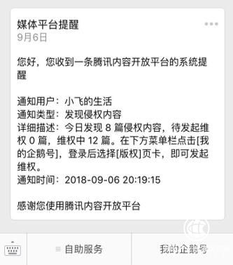 已授权企鹅号如果有文章被侵权,“腾讯内容开放平台”公众号将通过日报/周报的形式向作者推送公众号提醒。作者可以在日报/周报中了解到自己作品被侵权的相关信息。