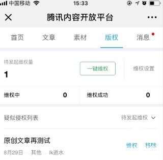 如果有待维权内容,企鹅号作者可以点击“一键维权”,点击后企鹅号版权系统会对所有待维权的内容发起维权,向侵权平台发送侵权通知,要求立即删除侵权内容、下线侵权链接,必要时会采取法律手段。