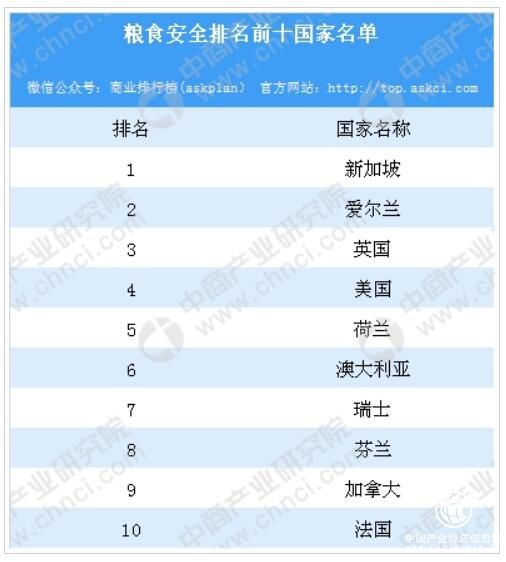 全球粮食安全排名前十的国家分别是:新加坡、爱尔兰、英国、美国、荷兰、澳大利亚、瑞士、芬兰、加拿大以及法国。排名前十的几乎均为富裕的欧美发达国家,粮食安全背后突显的是国家的经济实力。然而,倒数五名全部来自非洲,分别是:布隆迪、刚果民主共和国、马达加斯加、也门和塞拉利昂。