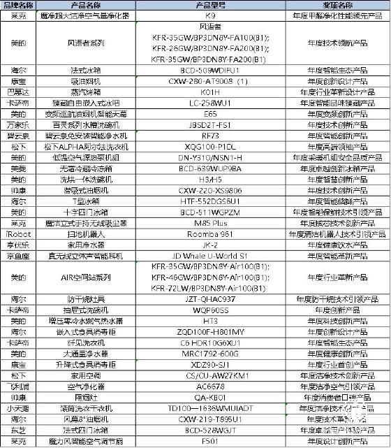 本次荣获“金选奖”的品牌主要有海尔、美的、松下、巴慕达、TCL、卡萨帝、戴森、京鱼座、小天鹅、美菱、帅康、享优乐、iRobot、莱克、万家乐、康宝、东芝、飞利浦等,产品涵盖空气净化器、壁挂式空调、中央空调、冰箱、冰吧、洗衣机、消毒柜、烟机、灶具、净水器、洗碗机、扫地机器人、烤箱、吸尘器、耳机等各大硬件科技品类。(具体产品型号见文末附表)