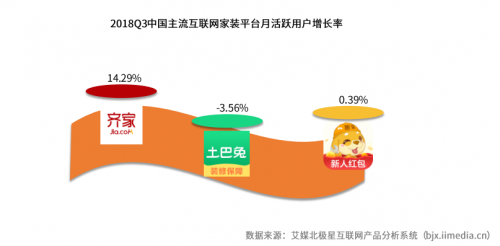 过去的2018年,互联网家装市场开始进一步分化。根据艾媒报告显示,2018年第三季度,齐家网月活跃用户增长率达14%,而土巴兔月活跃用户增长率则为-3.56%,出现负增长,下滑趋势明显,与齐家网的差距持续拉大。