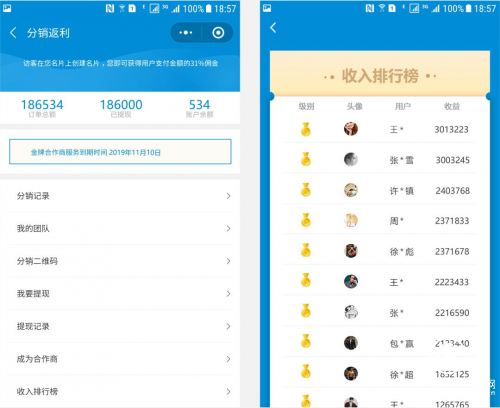 张琳随即给我们展示了“绘赢智能名片”的核心分销模块,其模块设计出发点就是不仅可以做到自用轻松拓客,还能做到分享轻松赚钱。名片访客A通过自己的名片创建名片,自己立得支付金额31%的佣金;名片访客B通过A用户的名片创建名片,自己又立得B用户支付金额31%的佣金。以A直接邀请100位B计算,这100位B又各自邀请100位C,轻松可赚到近31万元。如果升级成为银牌合作商,佣金更高,轻松赚百万,升级成金牌合作商,深度裂变、多层发展,几个月赚几百万很正常,目前在系统排行榜上,做的最好的一位金牌合作商,之前工作是资深保险经纪人,最近几个月专职做绘赢智能名片,已经入账300多万了,而且收入还在继续增长。因为名片是刚性需求,市场庞大,未来大有可为。
