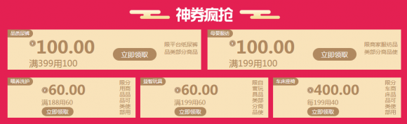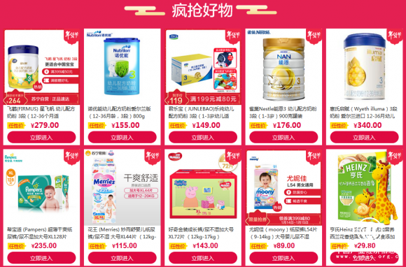 春节就俩字,年味。孩子也不例外,吃穿玩乐行,样样不能少。在吃穿方面,飞鹤星飞帆 、诺优能(爱尔兰版)、惠氏启赋(爱尔兰进口)等幼儿配方奶粉种类全、价格好,保证孩子口粮不断货;大王、好奇、花王、尤妮佳、帮宝适一线大牌纸尿裤保护孩子小屁屁。在玩乐和出行方面,猪猪侠猪年豪华大礼包、贝贝卡西汽车用儿童安全座椅、好孩子Goodbaby婴儿推车等成了家长们过年奶娃必备佳品。