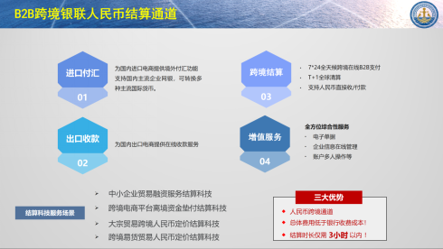 平台三大优势:人民币跨境通道、总体费用低于银行收费成本、结算时常仅需3小时。由该平台运营的易企融资系统,将为会员企业提供全方位的贸易往来人民币结算和供应链金融服务,通过解决中小微企业融资难融资贵、传统贸易结算周期长、手续繁琐的业务瓶颈问题、实现跨境贸易的便利化,共同为跨境结算科技平台保驾护航。