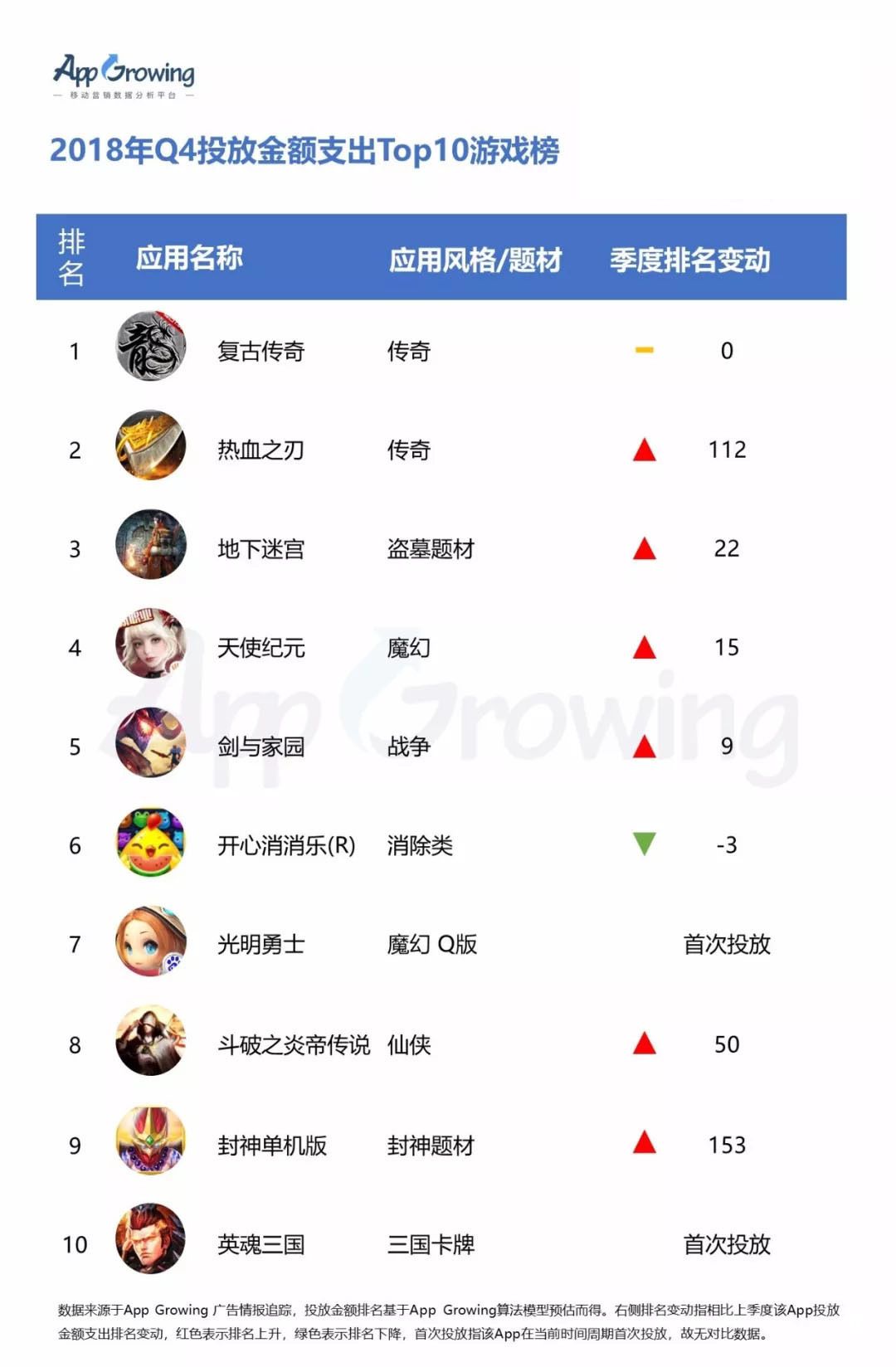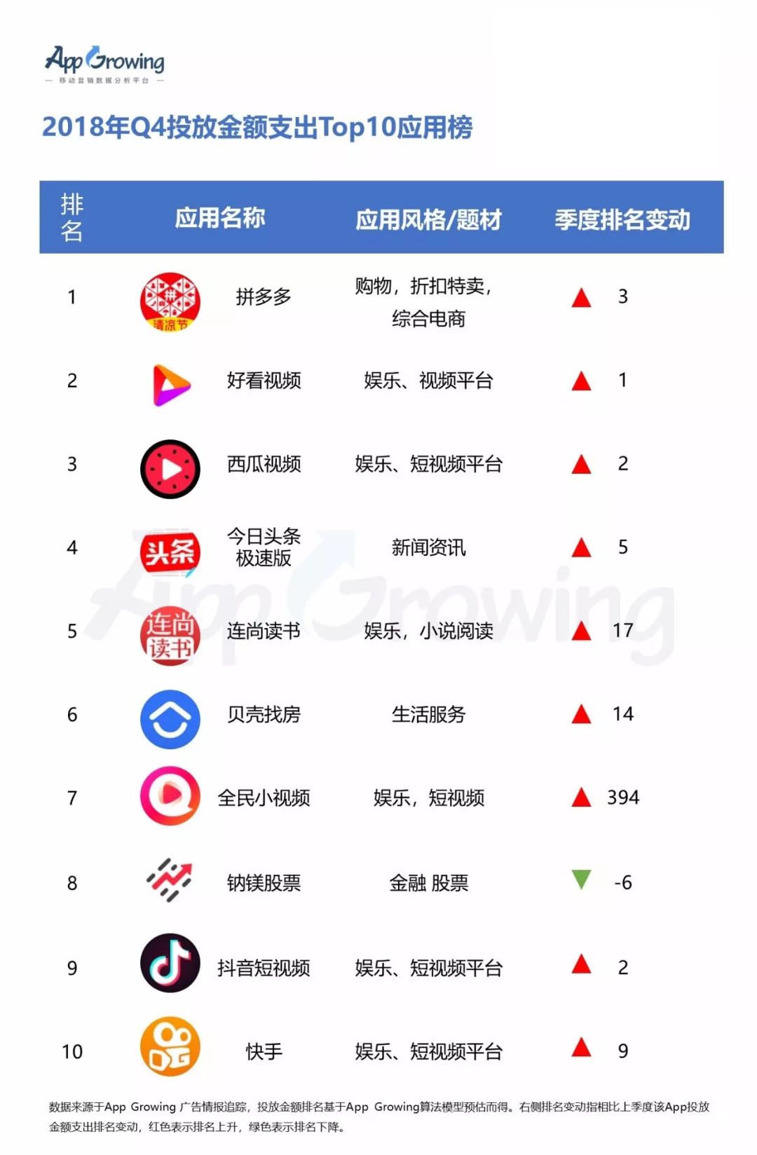 以上为2018年 Q4 投放金额支出Top10游戏及应用排行榜Top10,登录App Growing官网查询更详细的排行榜信息。