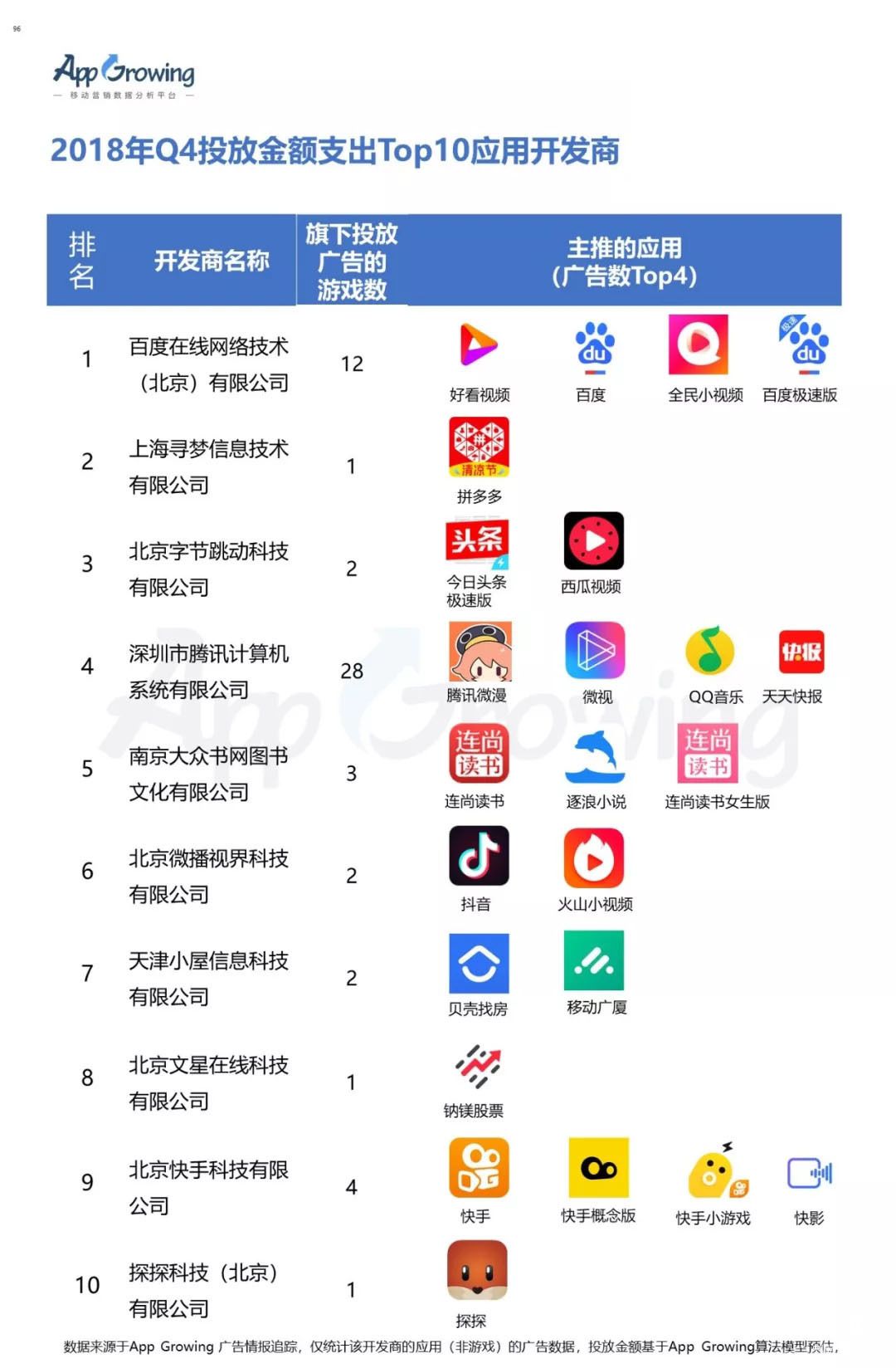 2)2018年Q4 投放金额支出Top10应用开发商