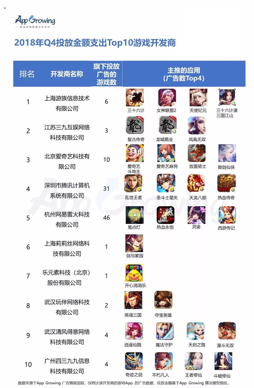 上海游族信息技术有限公司位列2018年Q4 投放金额游戏开发商榜榜首,旗下共有6款游戏在期间有投放广告,《三十六计》、《女神联盟2》、《天使纪元》为其持续主推游戏。而 北京爱奇艺科技有限公司则紧随其后,棋牌类游戏《爱奇艺斗地主》《爱奇艺麻将》为其重点推广的游戏。