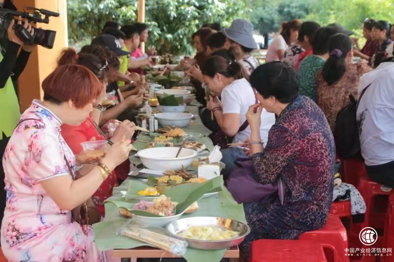五里路茶韵共享农庄为游客们准备了特色的黎族长桌宴,黎族长桌宴是黎族宴席的最高形式和最隆重的礼仪。桌上铺满绿油油的芭蕉叶,上面盛着竹筒饭、小鱼干、三色饭、农家豆腐、白切鸡等当地特色美食。菜过五味,游客们换上了黎族服装,参加了摘山兰稻稻穗的比赛,充分体验了黎族同胞的生产和生活,享受丰收的喜悦。