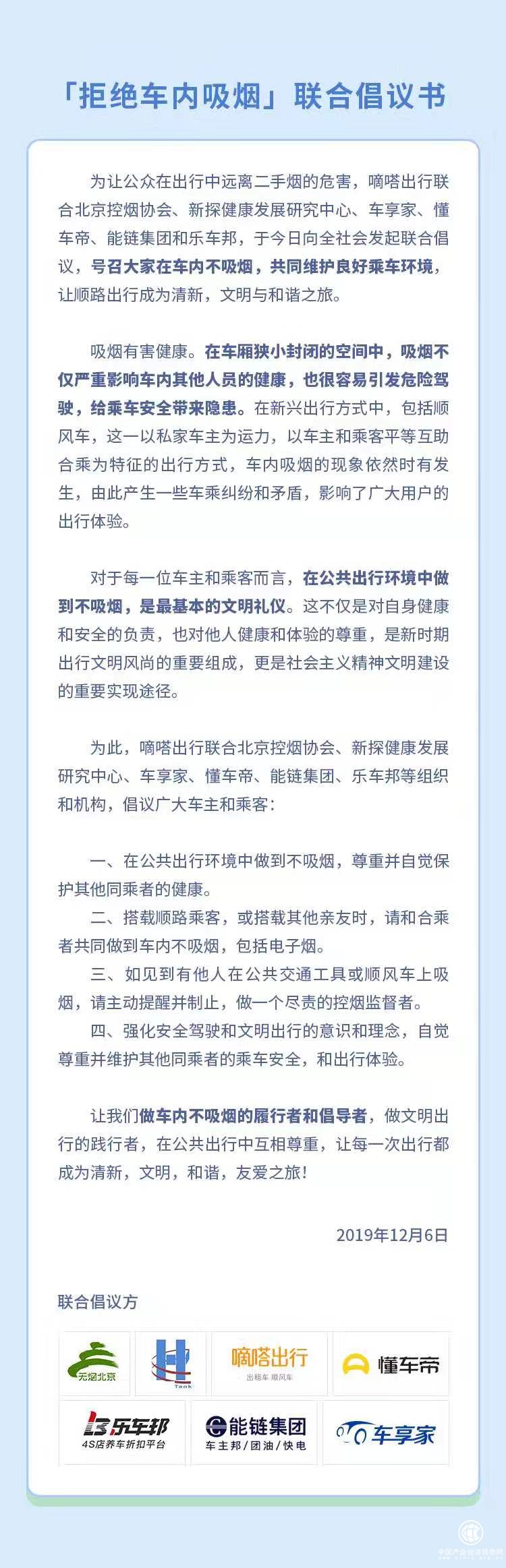 此次参与拒绝车内吸烟联合倡议的各方包括:嘀嗒出行,北京控烟协会、新探健康发展研究中心、懂车帝、能链集团、乐车邦和车享家,涵盖了出行平台,公益组织,研究机构,汽车资讯和汽车服务等领域,从车主,用户和公众等多个层面入手,充分展现了车内禁烟这一行动的巨大号召力和社会价值。