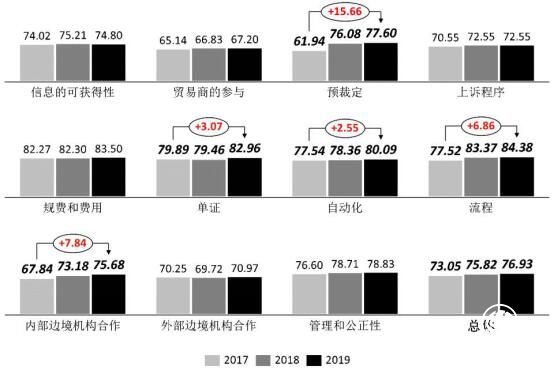 此外,单证及流程改进显著。报告显示,2019年贸易便利化各领域中,通关流程表现最佳,对应指标得分为84.38,为年度最高分,较2017年上升6.86。通关单证对应指标得分为82.96,较2017年上升3.07。