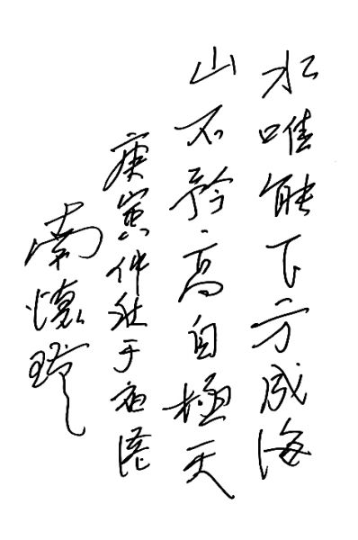 这次辞行时,老师要我在他的办公桌旁坐下来,抽出一张空白A4纸,想了想,给我写了两句话:“水唯能下方成海,山不矜高自极天。”接着破天荒地写下落款“庚寅仲秋于庙港”,并签了大名。这来自《孔氏家语》,也是演变自《道德经》的精华,是可以管我一生做人做事的道理,却未想到是老师的最后一次诲勉。现在回想,不由得一惊——正是2年后的彼日彼时,他驾鹤西去,永远离开了我们!