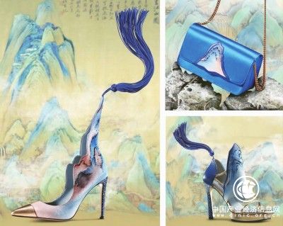 《千里江山》系列缂丝高订箱包、女鞋。PACC携手第六代缂丝传承人王建江与中国原创文化设计鞋履品牌sheme设计师李丹、海派设计师苗海燕共同创作。