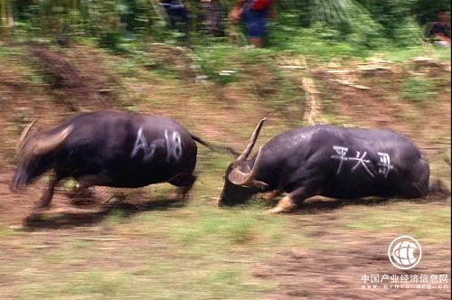 比赛还未开始,闻讯而来的游客以及周边村寨的群众早早地就把斗牛场围得水泄不通。斗牛场上,强壮的水牛威风凛凛,蓄势待发,随着主持人宣布开始,刹时,人群欢声雷动,唢呐喧嚣,鼓乐齐鸣,主人刚松下手中的套绳,两头水牛便急速地迈开步伐四角相撞,双方实力相当僵持不下。激战中,难解难分者有之、打翻在地者有之、仓皇败逃者有之。比赛现场,惊险刺激的场面不时赢得观众阵阵喝彩,使得比赛现场高潮迭起、热闹非凡。