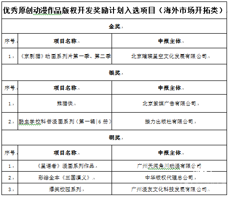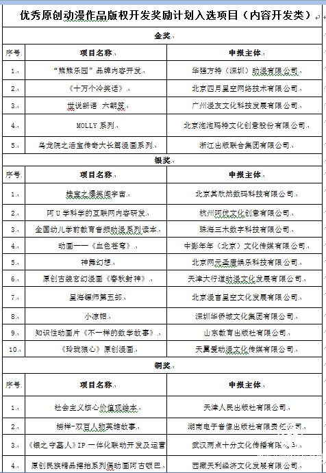 在国家新闻出版署指导和中央文化产业发展专项资金支持下,中国版权保护中心受托配套开展奖励计划,邀请来自动漫版权管理部门、动漫行业协会、版权公共服务机构、动漫教育研究机构、动漫企业等方面的多名专家针对国家新闻出版署征集推荐的160个优秀项目,根据评选规则,在经过项目申报、材料审核、专家评审、结果公示等程序后,最终评选出78个优秀项目,其中内容开发类金奖5名、银奖10名、铜奖22名,品牌经营类金奖3名、银奖8名、铜奖24名,海外市场开拓类金奖1名、银奖2名、铜奖3名。