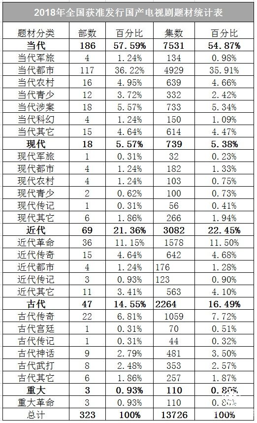 此外,2018年全年全国生产完成并获得《国产电视剧发行许可证》的剧目323部13726集。包括,现实题材剧目共计204部8270集,分别占总部数、集数的63.16%、60.25%。历史题材剧目共计116部5346集,分别占总部数、集数的35.91%、38.95%。重大题材剧目共计3部110集,分别占总部数、集数的0.93%、0.80%。
