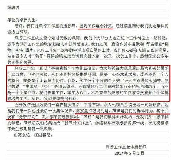 昨日下午,一个名叫“新风行工作室”的微博号发表了一则声明,称他们是风行工作室的摄影师,因工作理念冲突,经过慎重商讨决定集体向卓伟辞职。信中写道:八卦不是捕风捉影的猜测,需要求真求实,爆料不是一个人的舞台,需要整个团队通力协作。不希望辛苦完成的工作成果变成某个个体博眼球的工具。——“中国第一狗仔”是团队结晶,而不是一个明星网红。信中还强调:辞职是我们的群体行为,其中并没有“分赃不均”,请大家不要过度揣测。