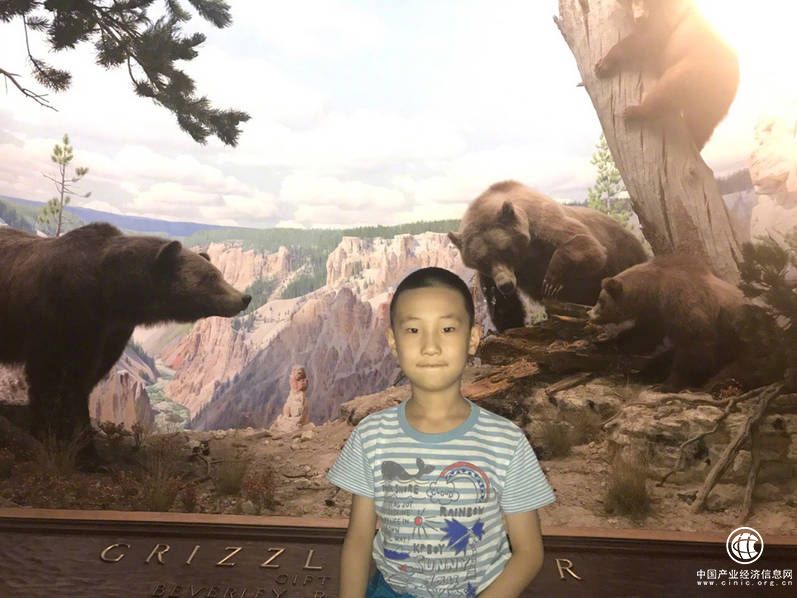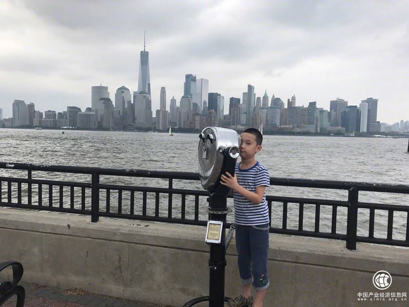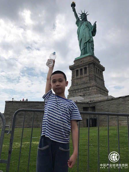 林永健儿子林大竣手拿矿泉水瓶当火炬站在自由女神像前模仿其造型拍照。