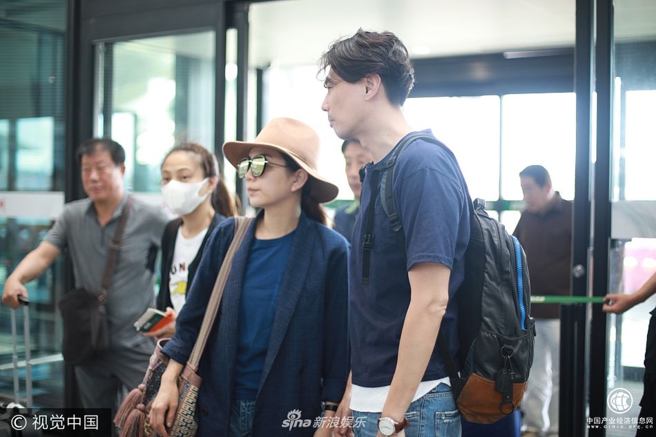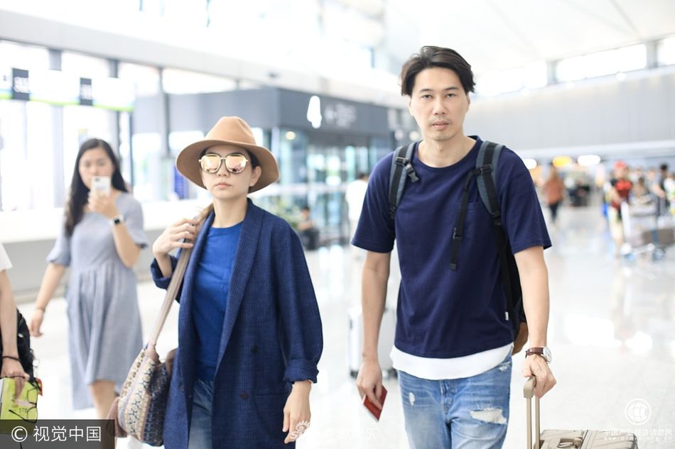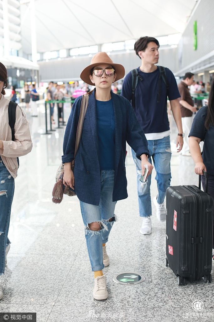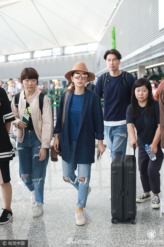 31日,Ella陈嘉桦与老公现身上海机场,Ella身穿蓝色西装破洞裤休闲范十足,老公一边紧跟保持距离为老婆保驾护航。(视觉中国/图)